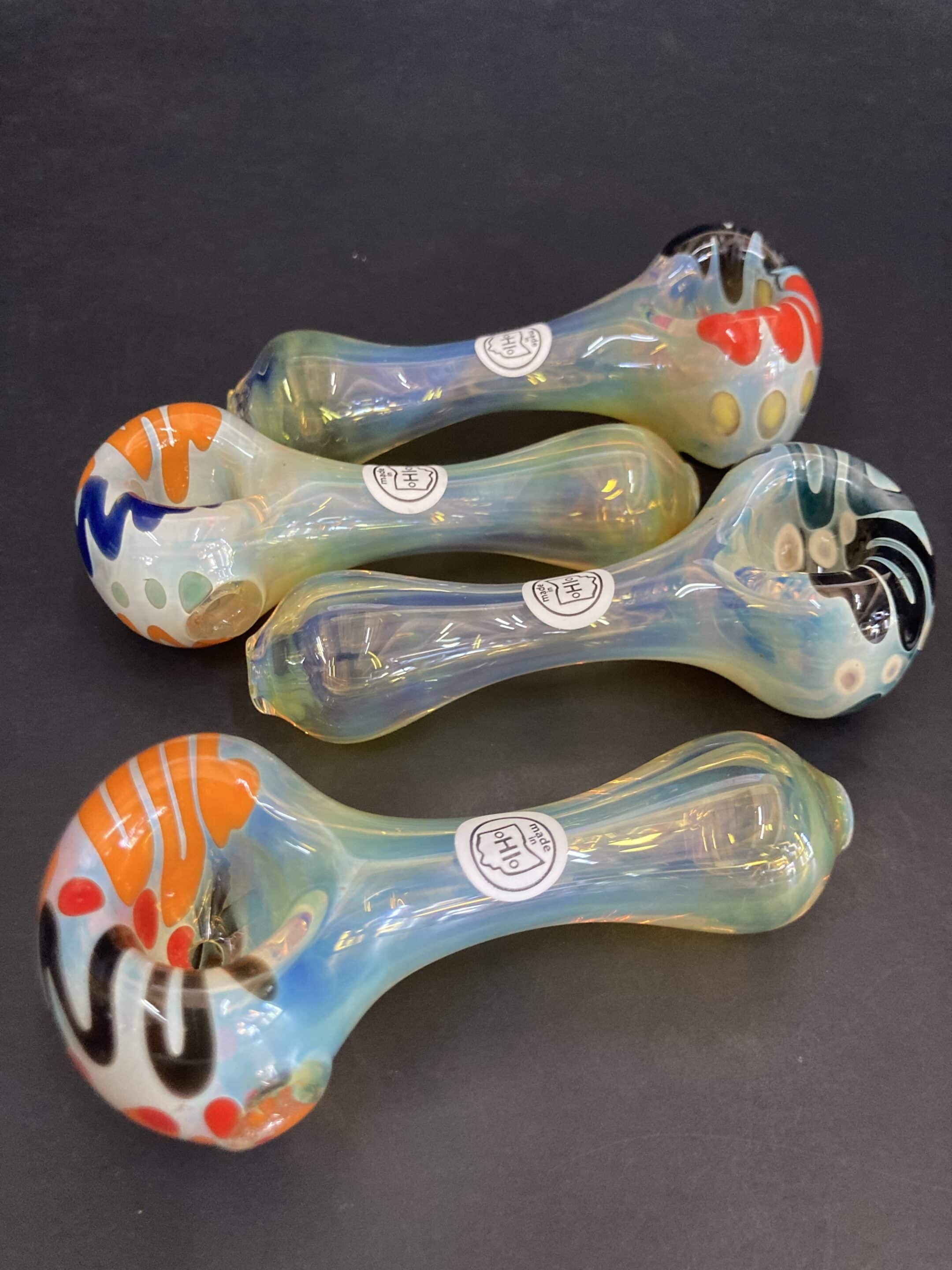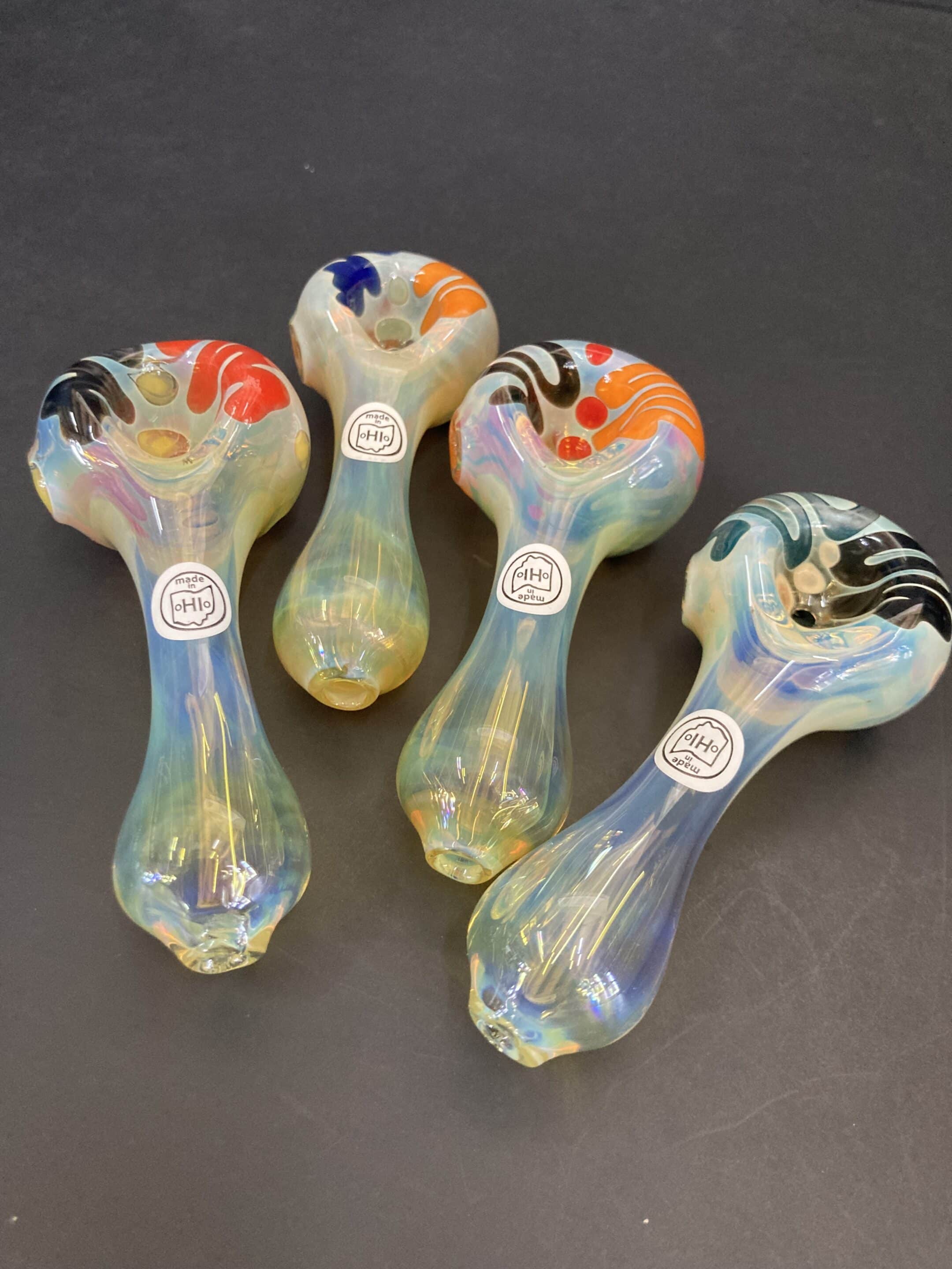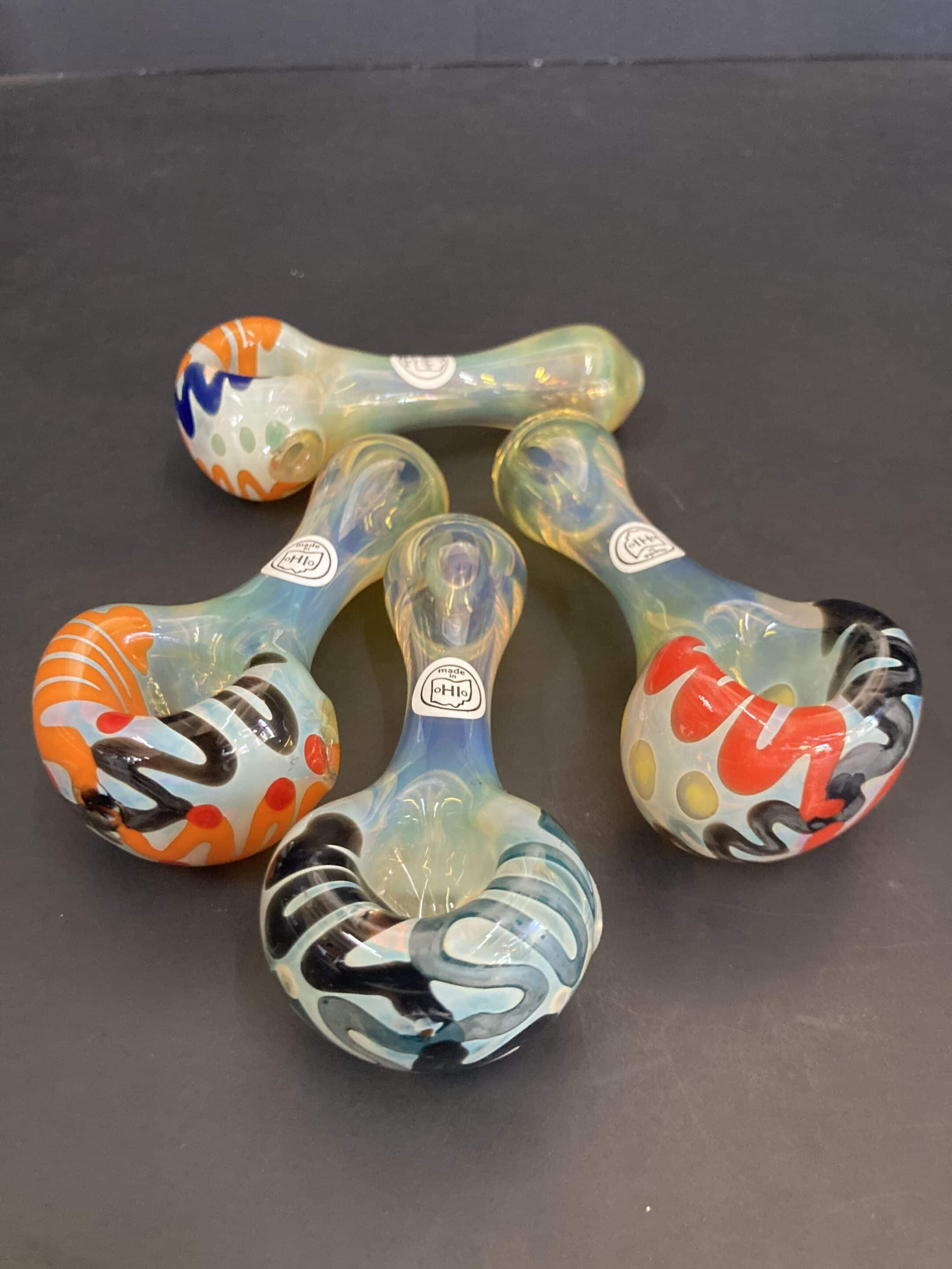 This is a surface worked, silver fume color changing pipe.  It has colorful squiggles & dots on the bowl piece.  Made by @darkwingdorkglass in our Dayton studio.