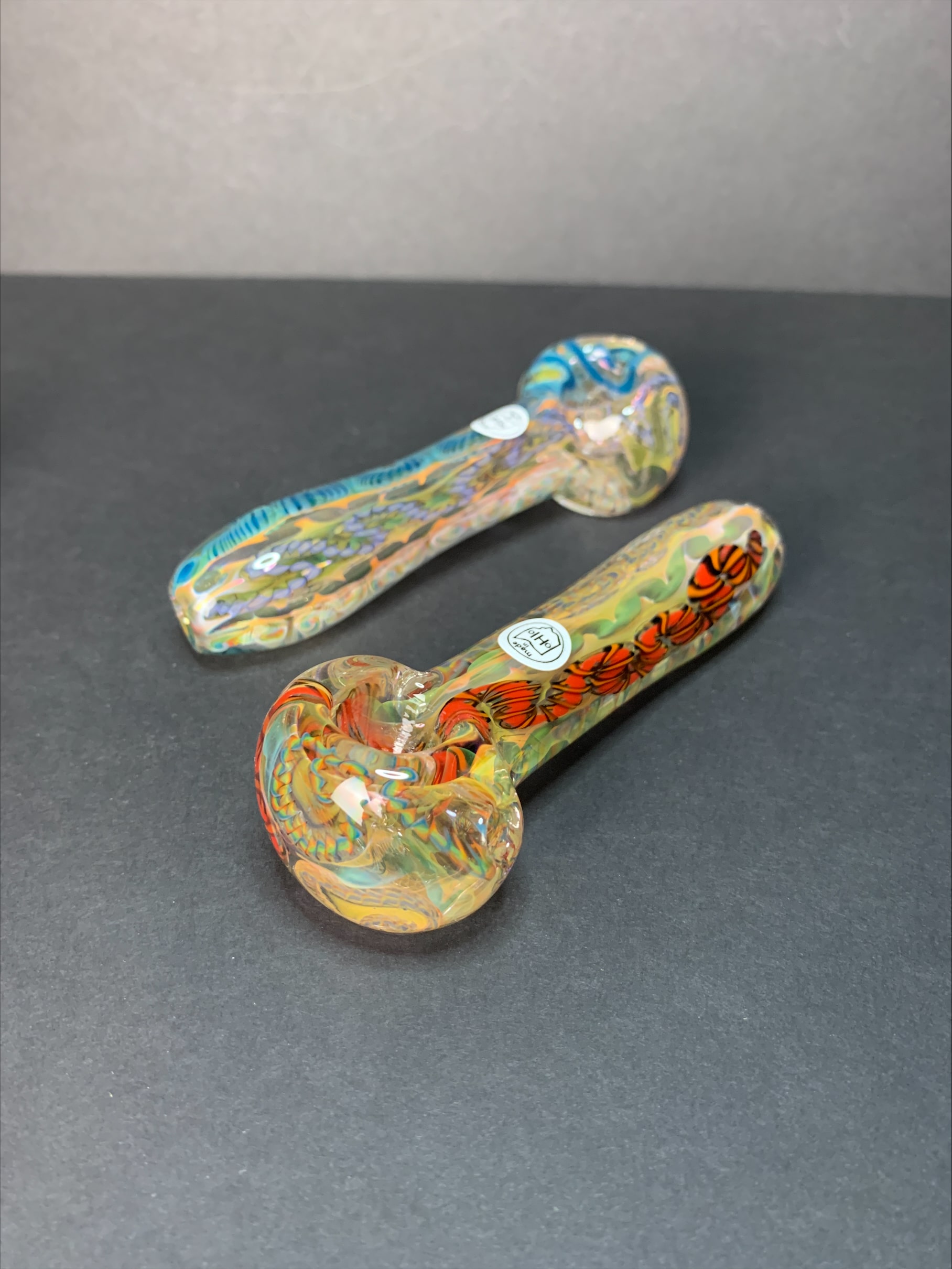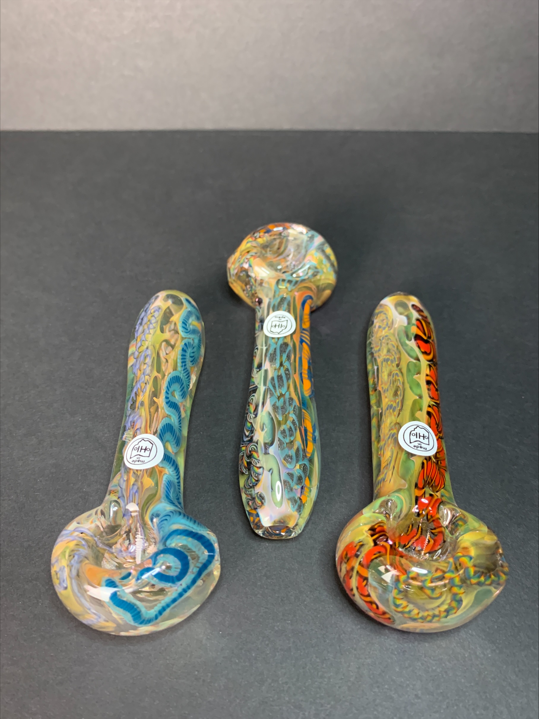 Thick inside out spoons with bright cane squiggles and poppin’ fume work. From Awrylophestaglass