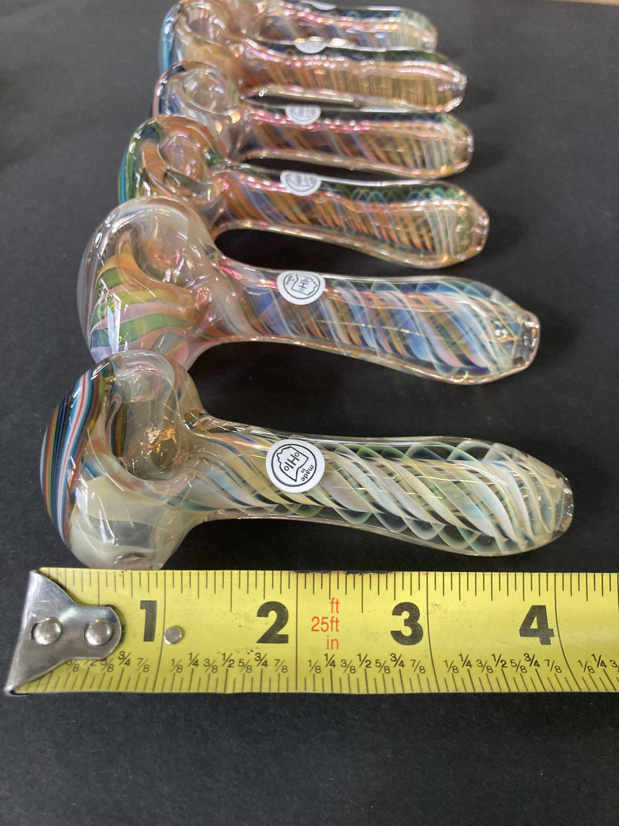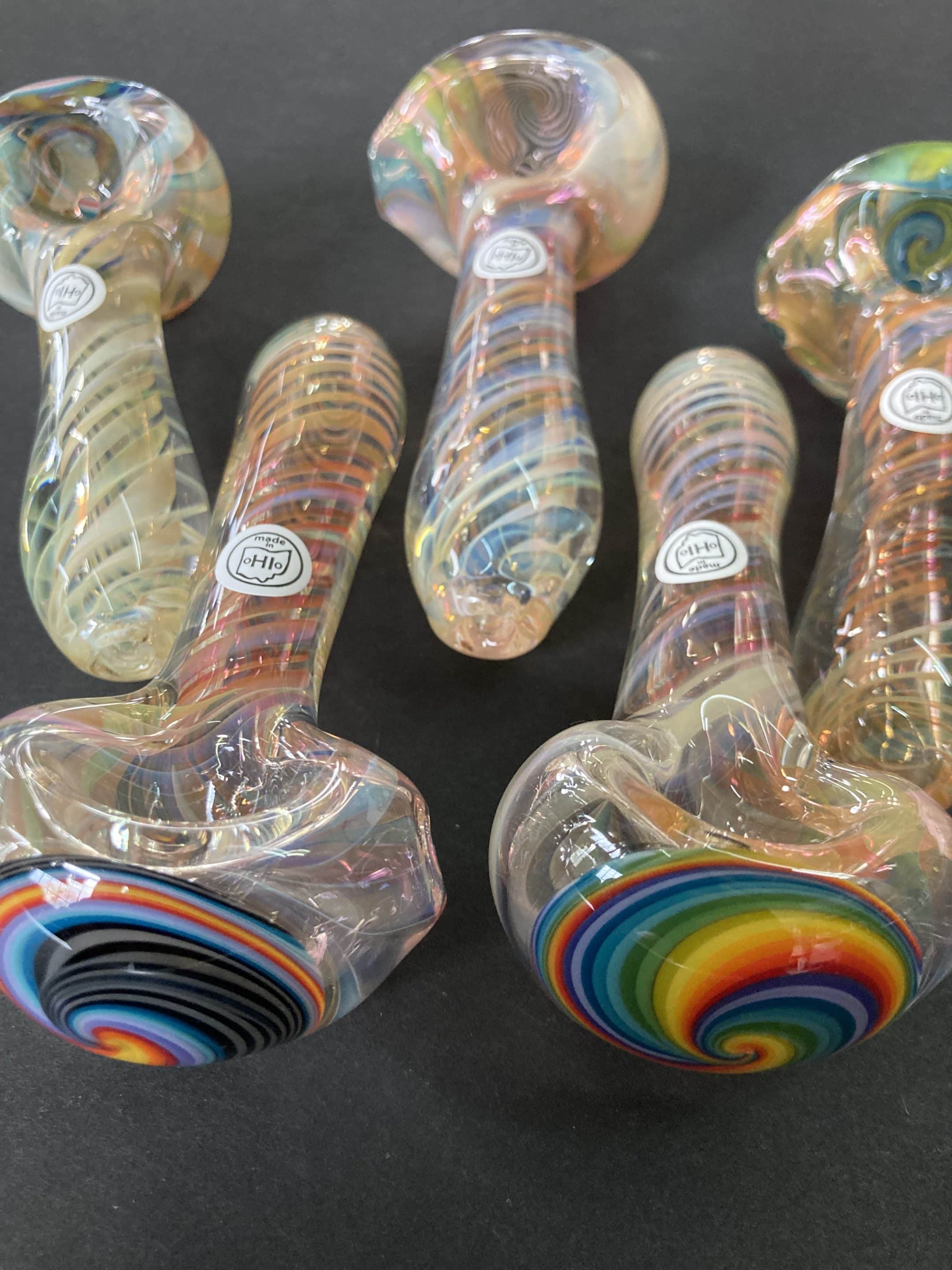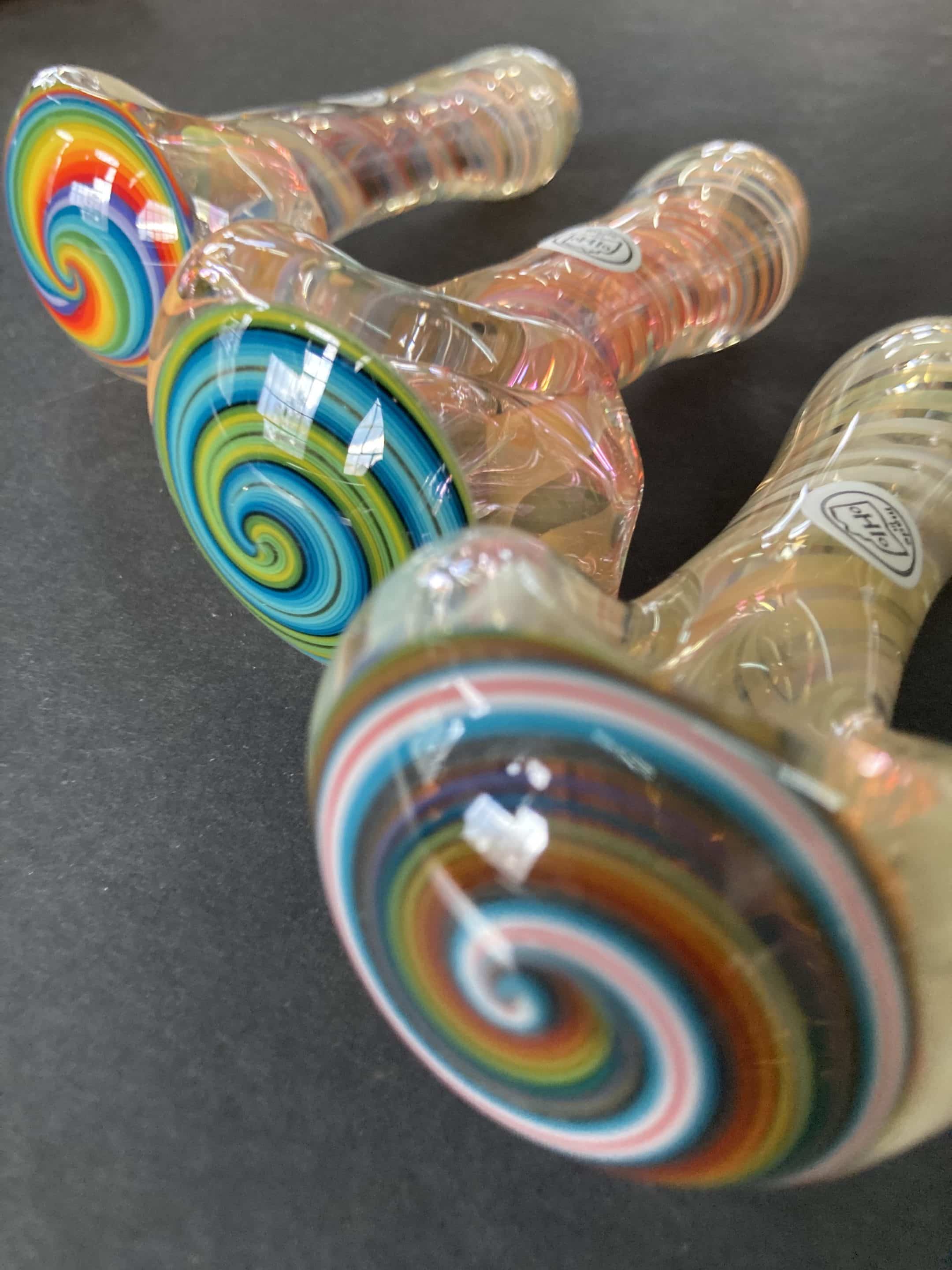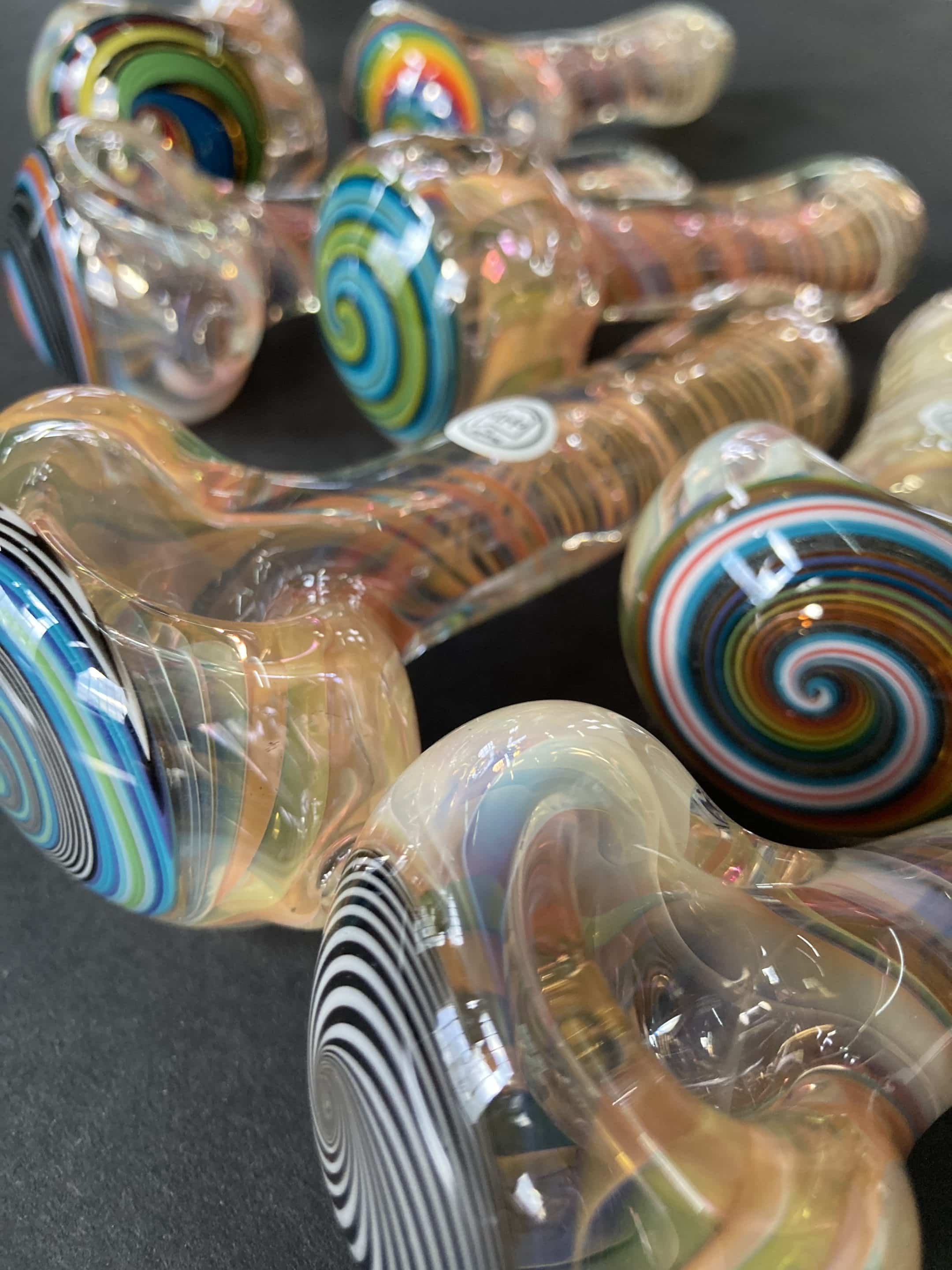 Thick inside out spoons poppin’ with silver & gold fume capped by linework spiral patches. Made by Aaron.