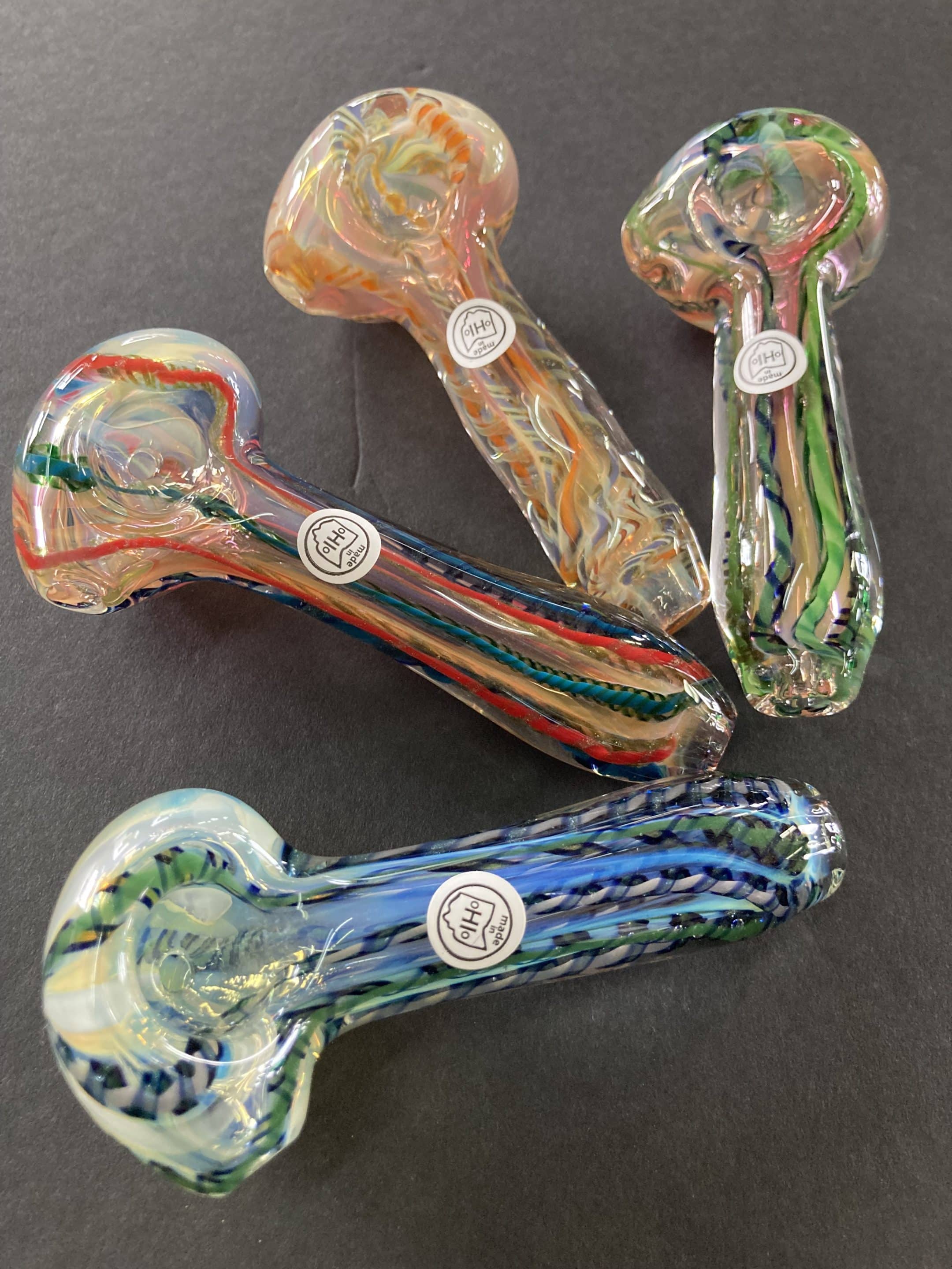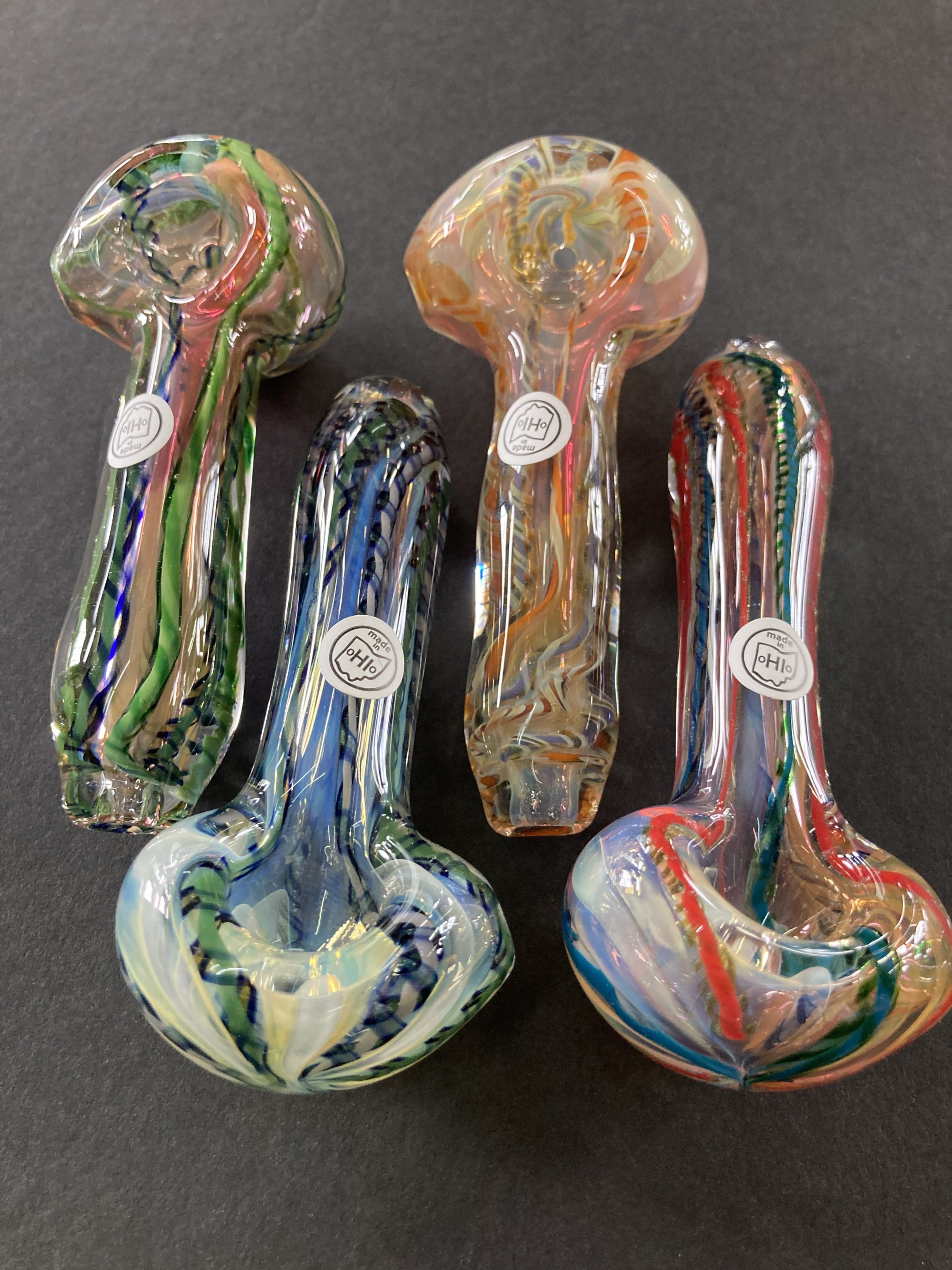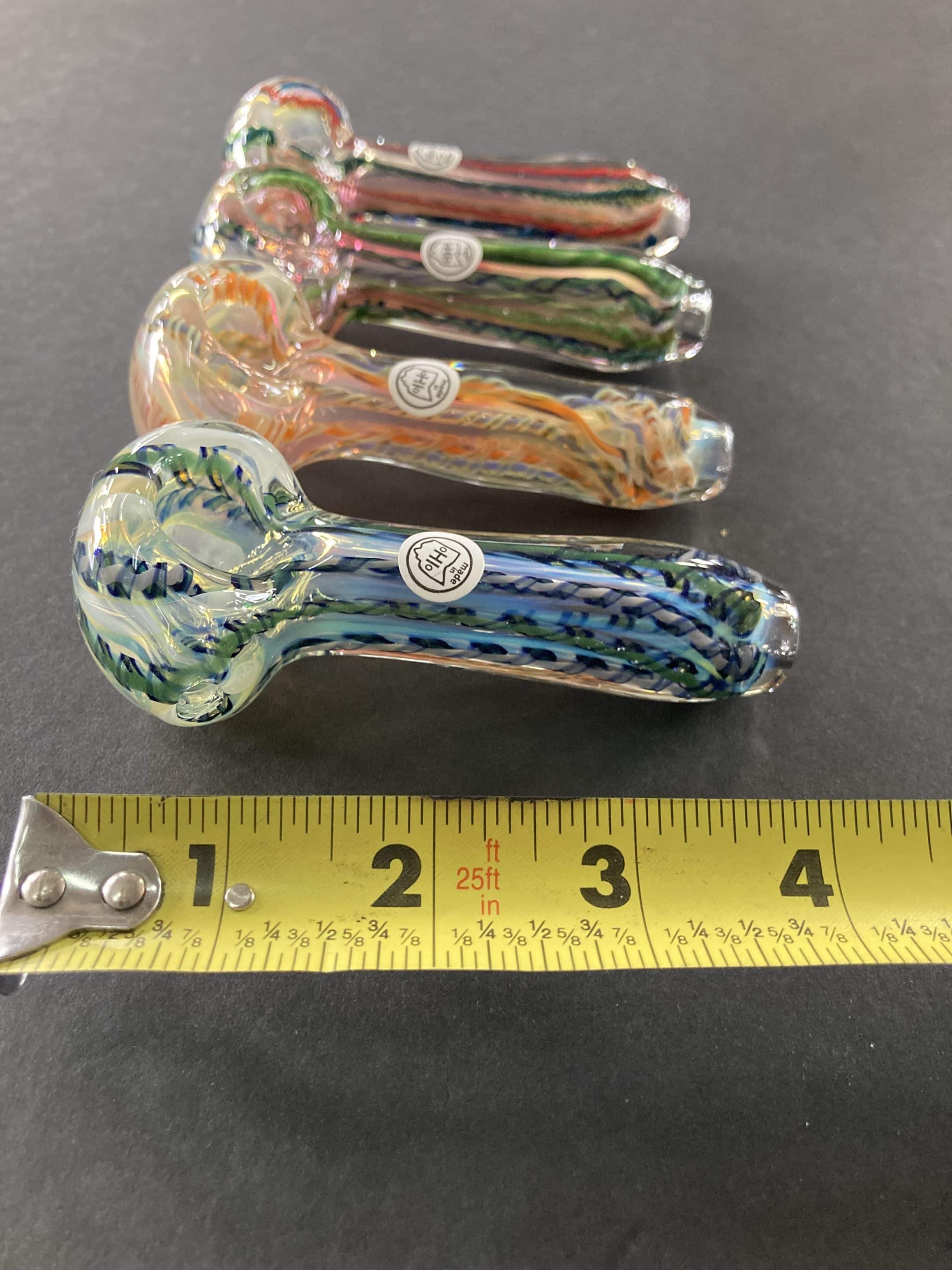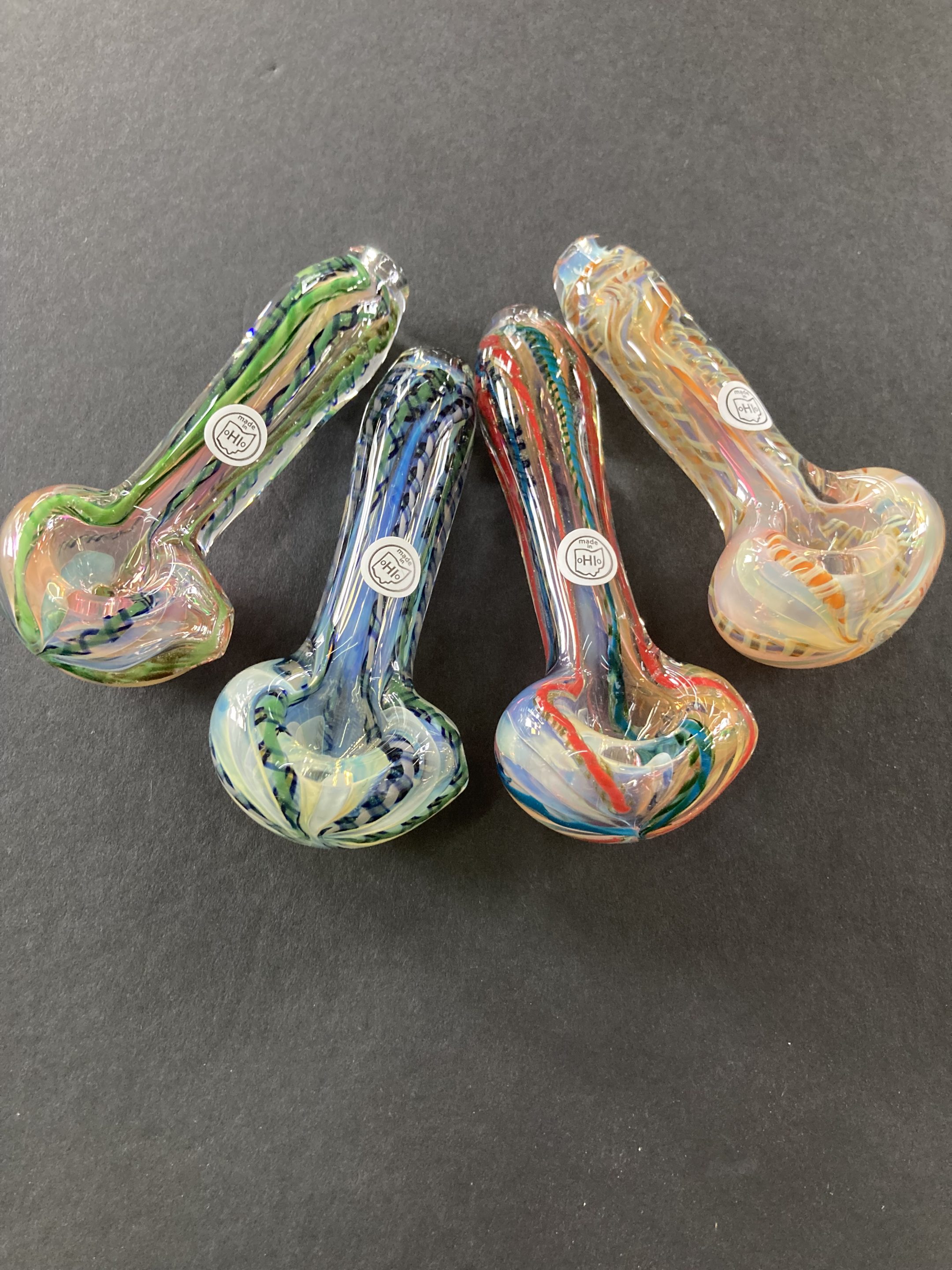 These thick inside out spoons are silver & gold fumed and decorated with 6 colorful lines of cane that run through the piece. From Ohio Valley Glass
